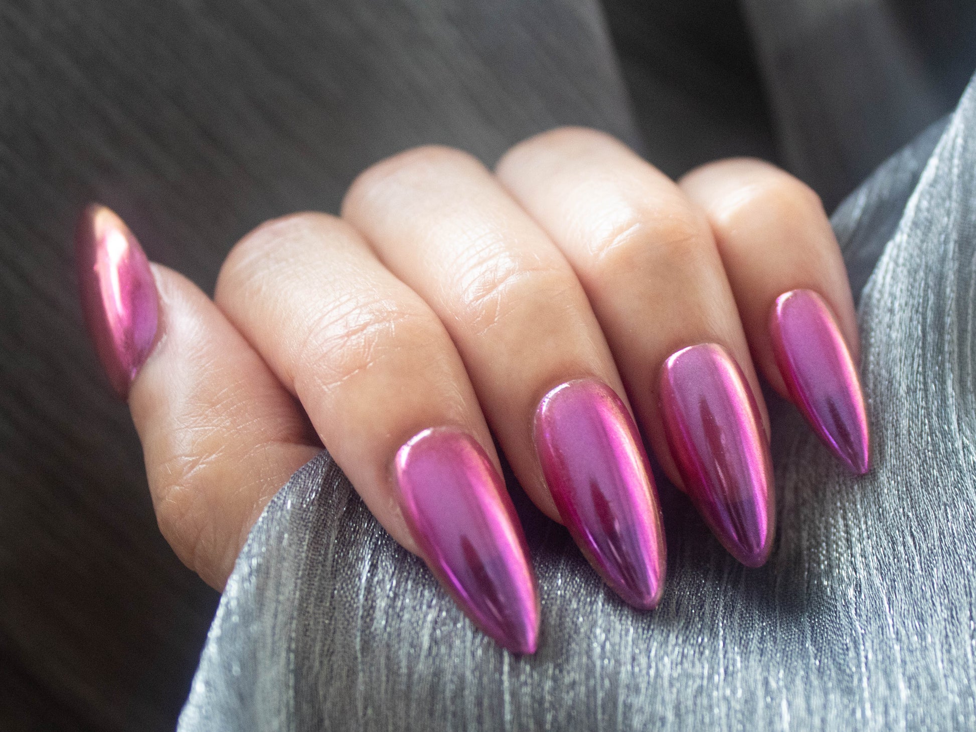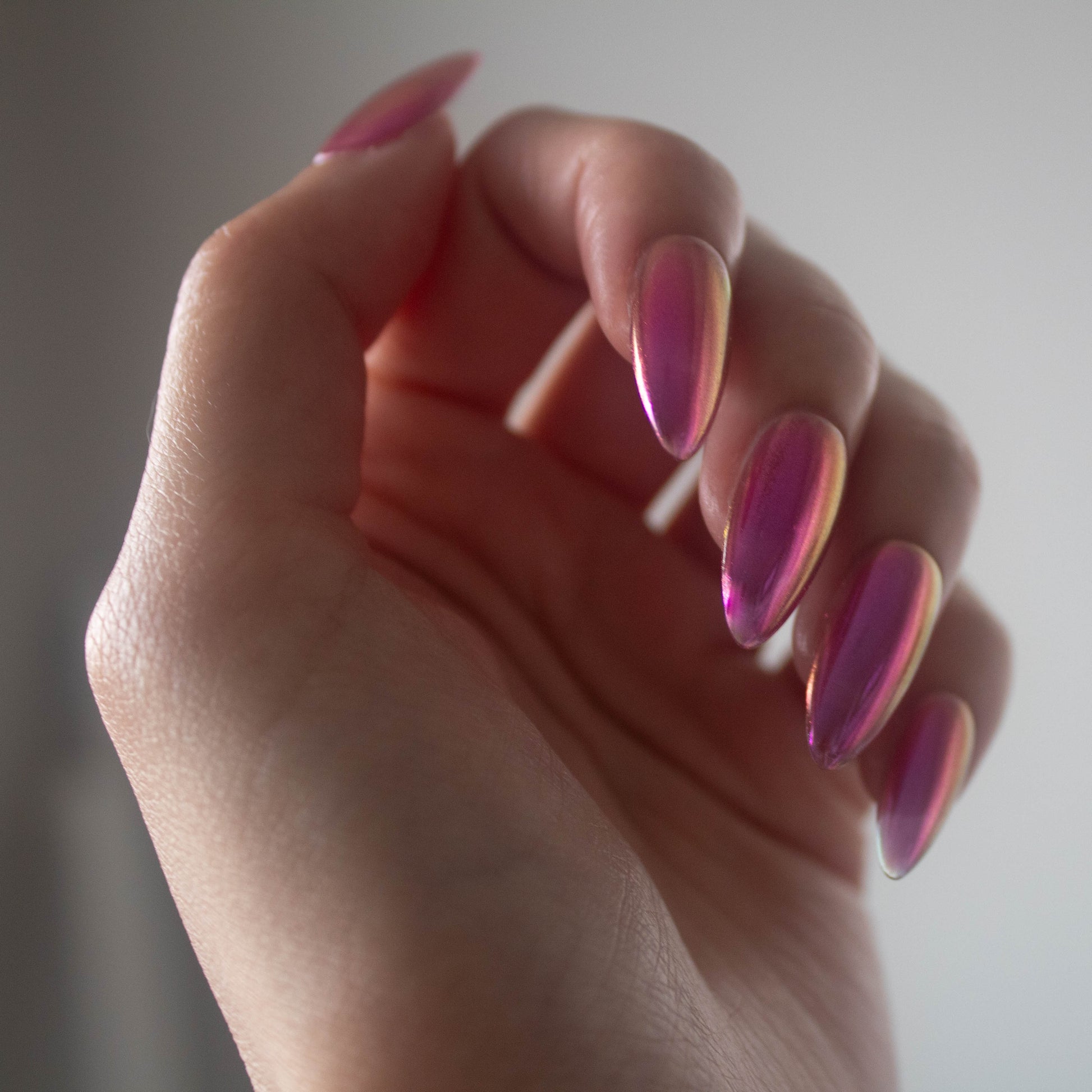 Translucent fuchsia purple topped with an iridescent chrome finish.