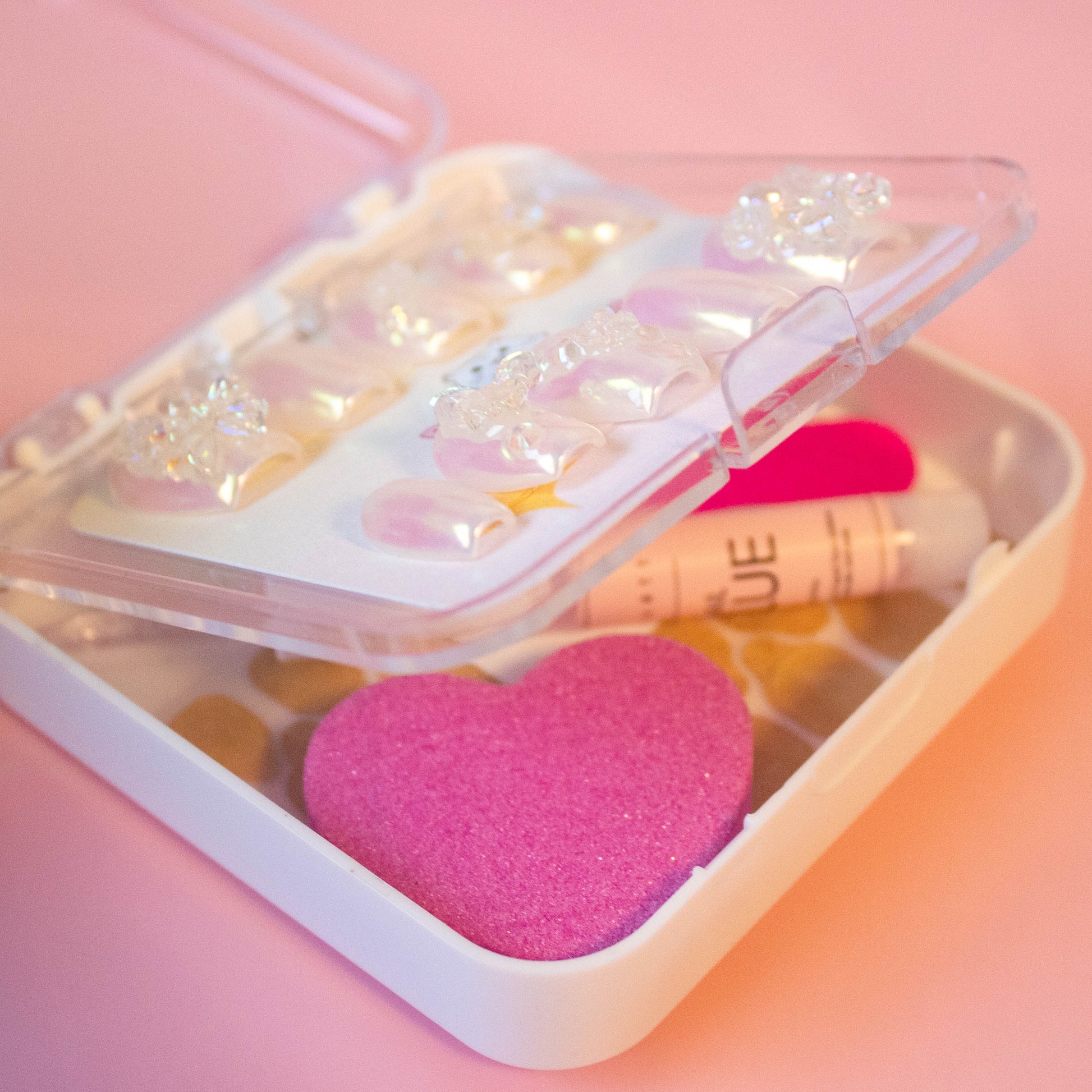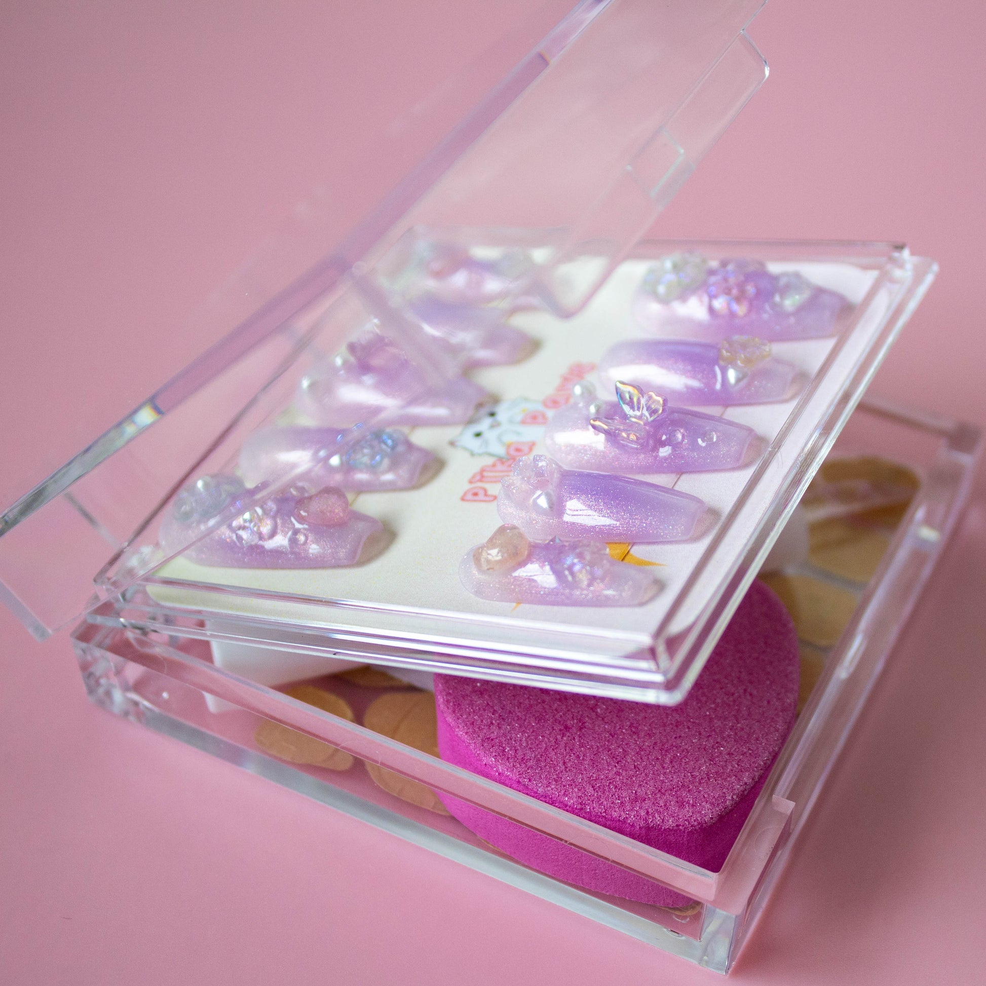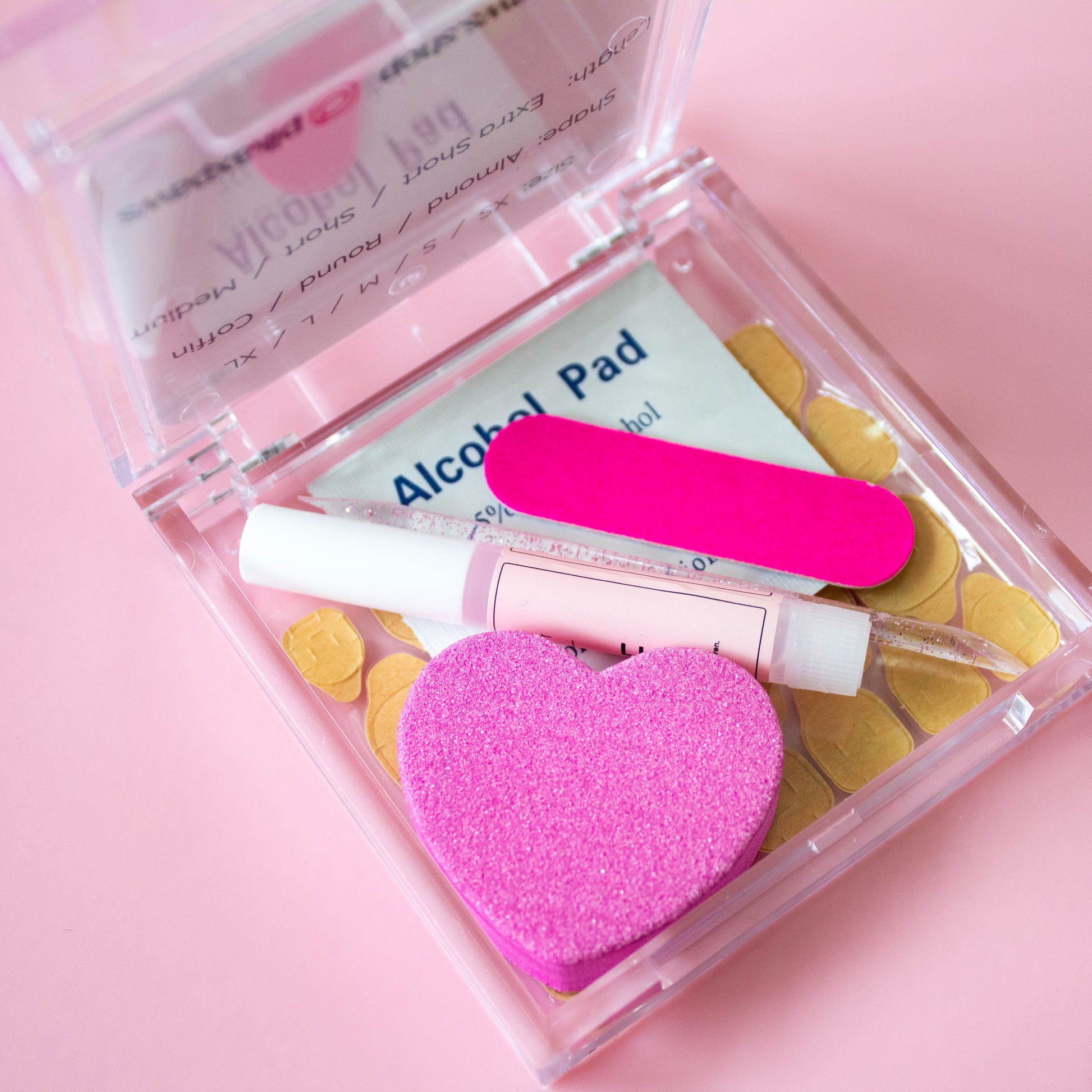 All-in-one storage case for your press on nails! Perfect for traveling or on the go, this double layered nail box fits everything you'll need. The extra storage can hold prep and application tools, an extra set of press on nails, or other trinkets!